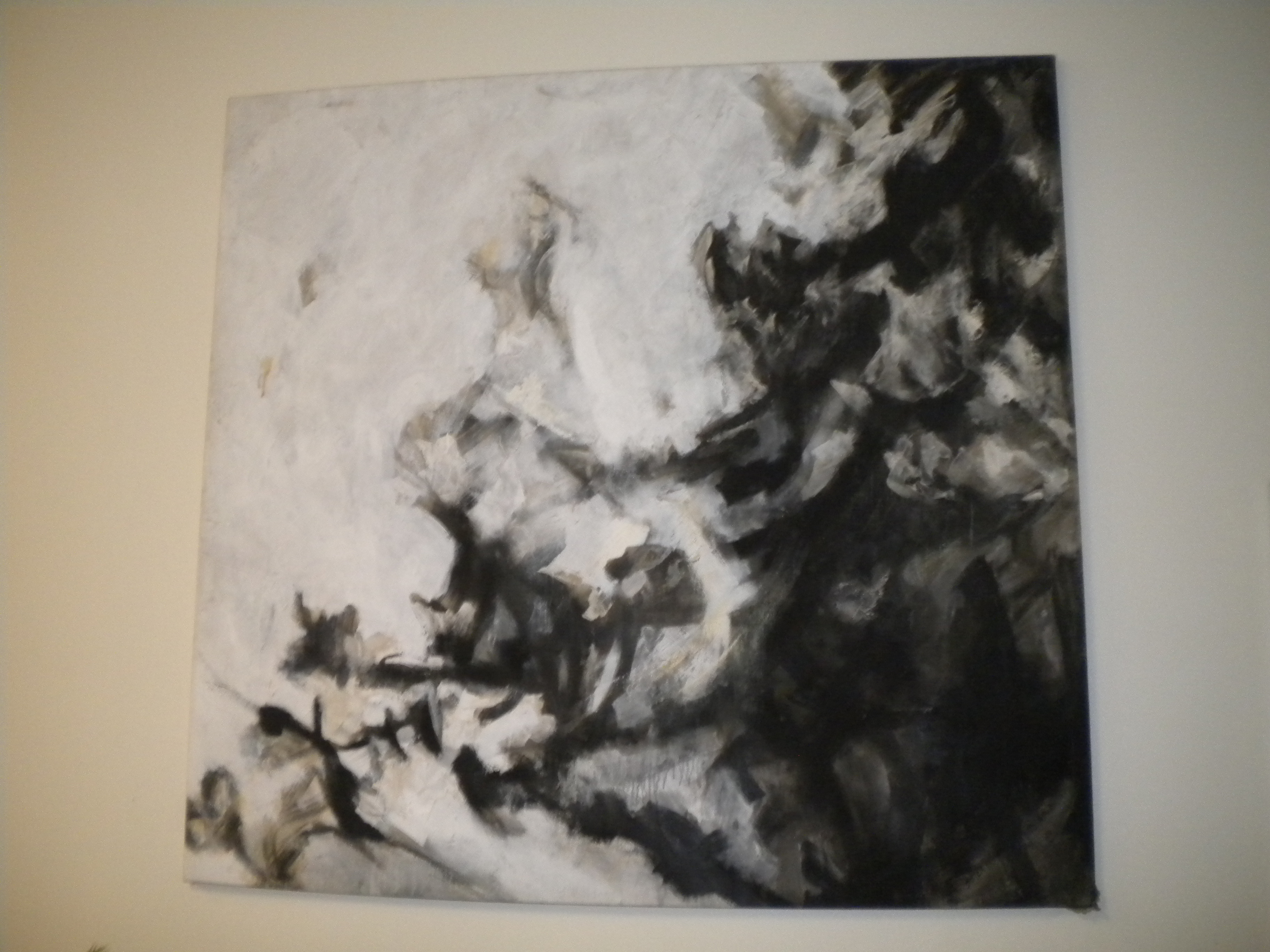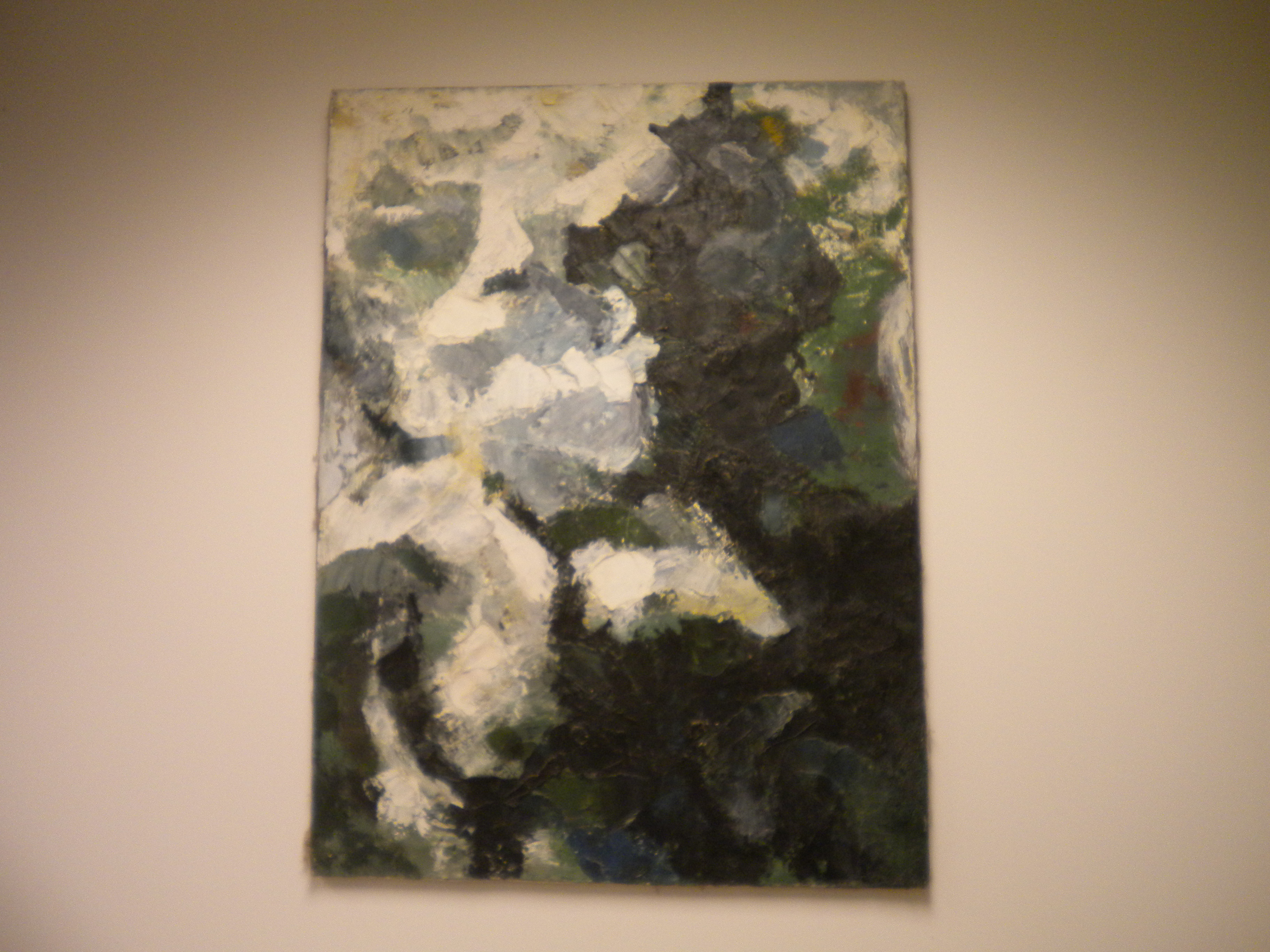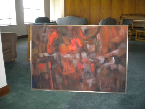 I understand the painting is signed but photo did not render this visible. It has been exposed for 34 years so I agree with my new friend that it probably could use a cleaning. It appears to be acrylic and very large, as most of her paintings during this time are. I am thinking that these abstracts were painted after she received her M.F.A. from University of Boulder, when she attended in 1965-66. I am hoping to find out what courses she took there…her style seems to have shifted to very strong abstract after her graduate studies in Colorado.
