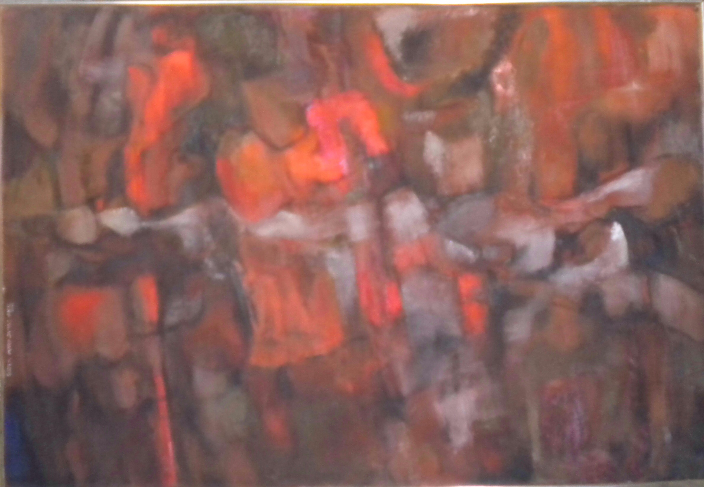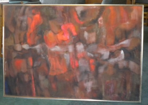 On the right side, halfway down I see a figure wearing a BVM habit. One interpretation is this a self portrait, doing one of two things she loved, painting or teaching. Is a large mural before her, her arm extended to the canvas, adding strokes of umber and scarlet, or are the abstract figures her students?