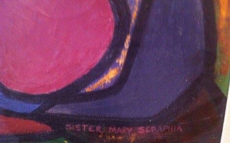 As I found it interesting, I believed the seller misread the signature and I began a brief Internet search for Sister Mary Seraphia and found your website about your Aunt’s amazing work. Maybe it was one of her earlier pieces? I have been to An Orange Moon previously in search of mid century furniture. The owner is quite nice. I would be interested to see if this is one of your Aunt’s works. Good Luck!