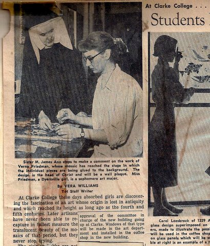 Verna Friedman was one of my aunt’s students at Clarke College in the 1950s. She has been very generous sharing her memories of my aunt. Earlier this spring, she sent me some clippings and a piece of work my aunt did as a class demonstration and then discarded in the trash. Verna decided to pick it out and save it. As she remembers: